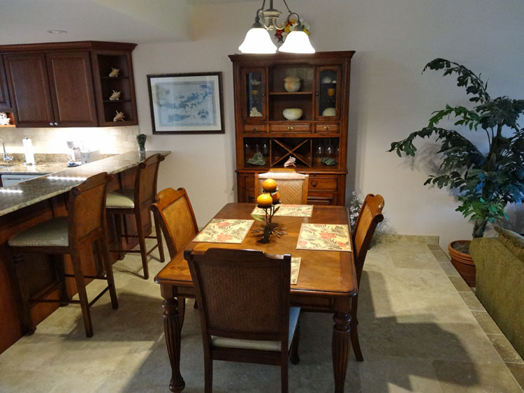 The graciously decorated living and dining area flow from the kitchen so everybody can enjoy vacation time together.