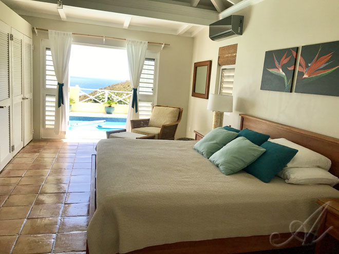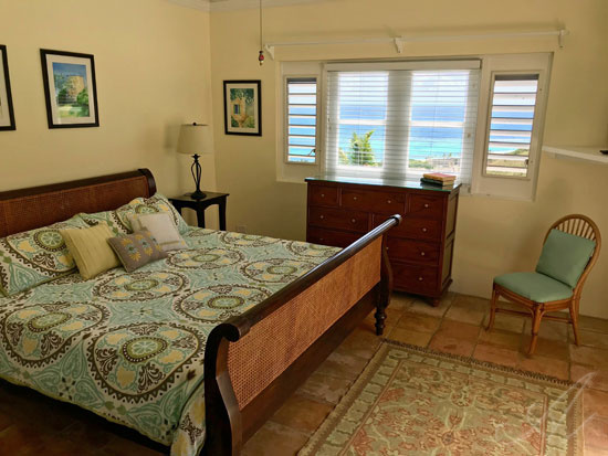 The second master bedroom suite features a king size that makes this villa nicely suitable for 2 couples traveling together! Ceiling fan, air conditioning, private bath with marble walk in shower and french doors open out to the pool deck.